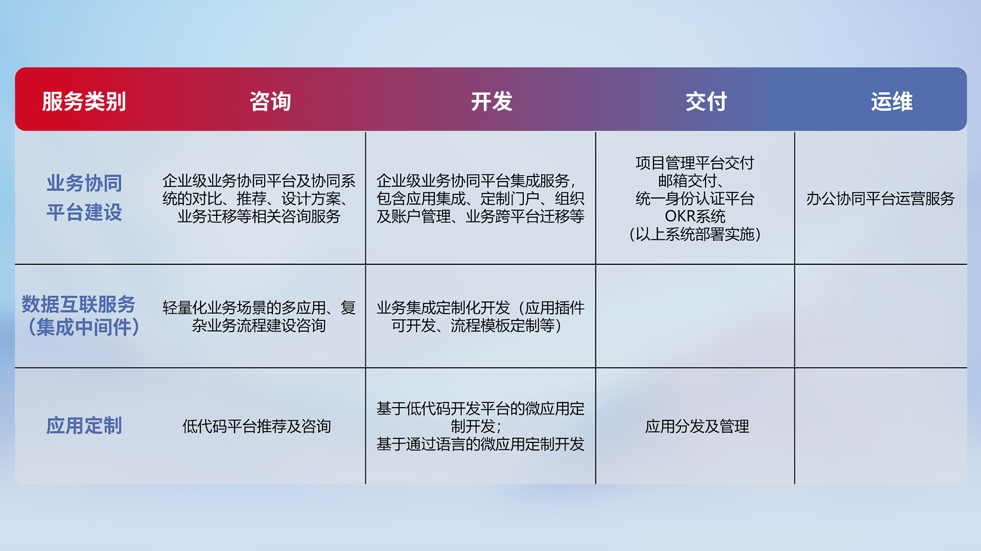 针对钉钉、、、、企微、、IDaas等平台级产品提供产品的规划、、、、方案、、、、交付、、、、定制化开发等服务,,,实现如统一协同办公、、、智能客户服务、、混合会议管理、、、智能数据查询、、、等业务场景,,,,实现数字化转型。。。。